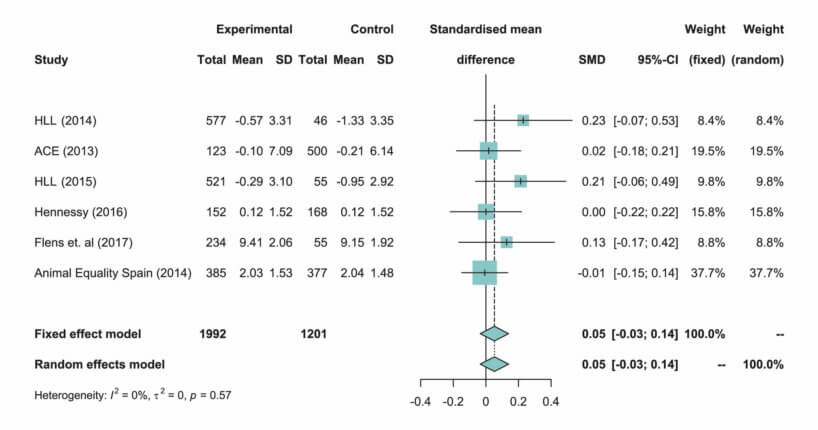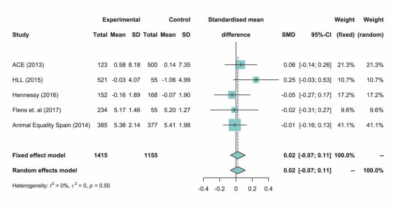 - The 95% confidence interval for each of the summary estimates from the meta-analysis overlaps with a point estimate of an effect size of zero. By following the conventionally applied frequentist framework of statistical inference, we would fail to reject the null hypothesis in all cases. In other words, we would not reject the hypotheses that leaflets have no impact on consumption of any of the particular animal products included in the meta-analysis (namely red meat, poultry, fish, eggs, and dairy).