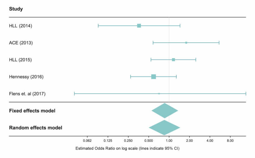 The fixed effects model is based on the assumption that the differences between the studies’ findings are due to sampling error.46 In contrast, the random effects model allows for the possibility that the true effect size differs from study to study in part because of real differences in the effect of the treatment in different circumstances, also known as study heterogeneity.47, 48 Our understanding is that there is no consensus on which model is preferable to use, but there is some evidence that fixed effects models overestimate confidence in treatment effects more than random effects models do, and that at least some Researchers believe there are only very limited circumstances in which a fixed-effects model is appropriate.49 Since there were potentially-significant differences in the circumstances and methodology of these studies, we will refer to the random effects model estimate when considering the results of this meta-analysis.
